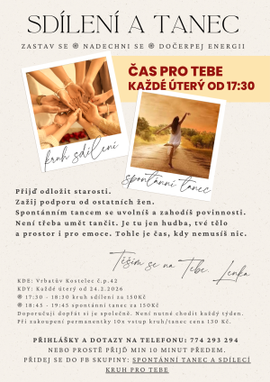 Každé úterý od 24.2.2026 v Komunitním centru Vrbatův Kostelec od 17.30 - sdílecí kruh a od 18.45 - spontánní tanec pro všechny ženy, které si chtějí na chvíli oddychnout od všedních starostí a načerpat energii.