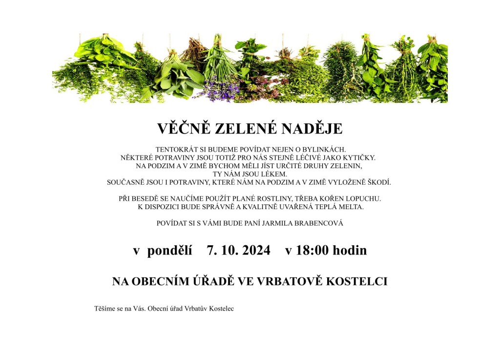 povídání o bylinkách proběhne v pondělí 7.10.2024 od 18:00 hod. v budově OÚ Vrbatův Kostelec.