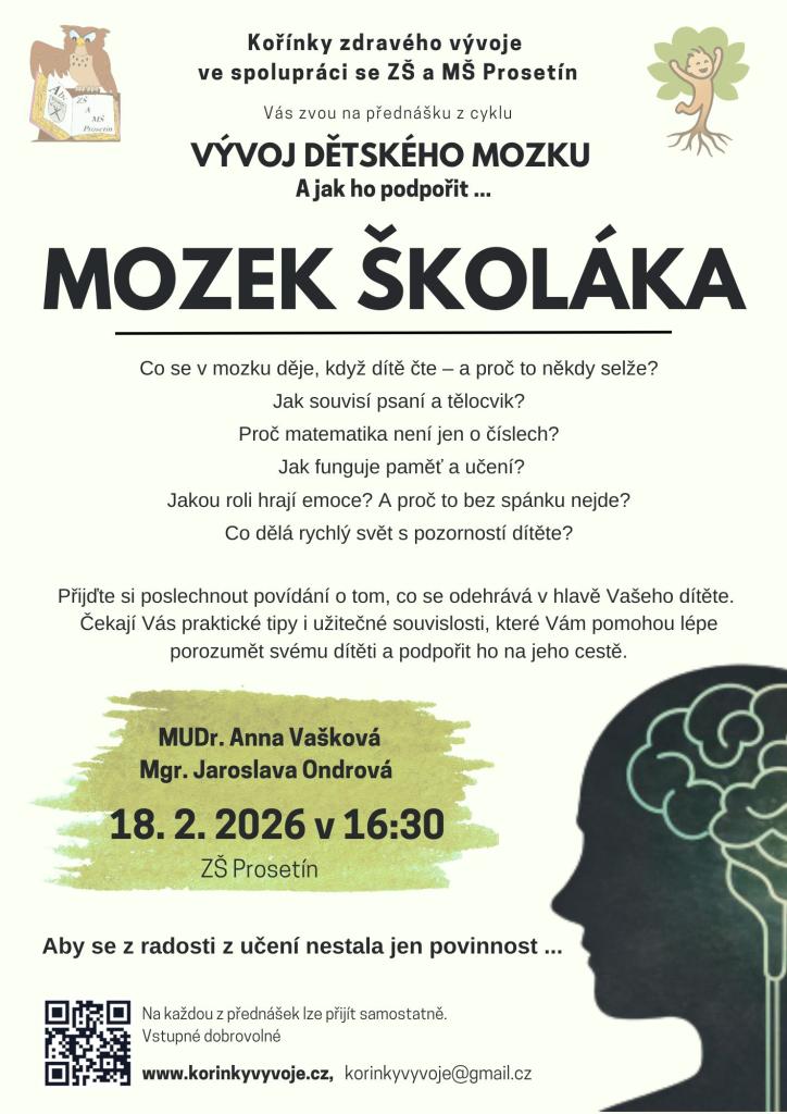 Kořínky zdravého vývoje ve spolupráci se ZŠ a MŠ Prosetín Vás zvou na přednášku z cyklu Vývoj dětského mozku - A jak ho správně podpořit... MOZEK ŠKOLÁKA.