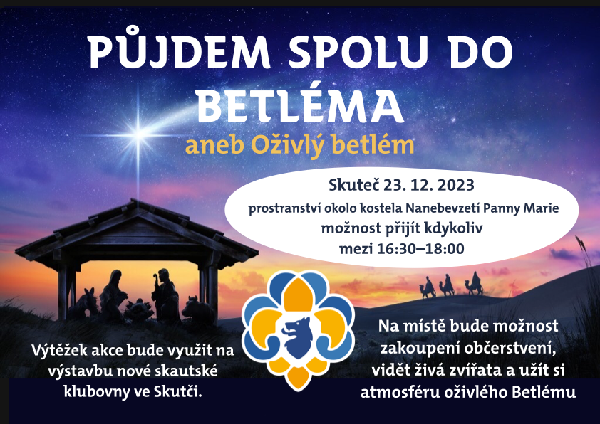 Skutečští skauti vás zvou na Oživlý betlém. Na místě bude možnost zakoupit občerstvení, vidět živá zvířata a užít si atmosféru oživlého Betlému. Výtěžek celé akce bude využit na výstavbu nové skautské klubovny.